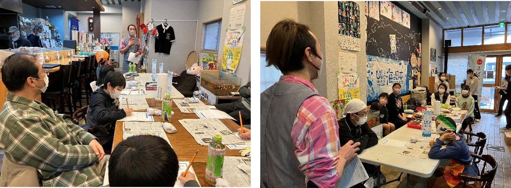 内藤さんの講義では、鮎は川で生まれ、海でプランクトンを食べながら育ち、また川に遡上して川藻を食べて育つということから、川と海はつながっているということが協調されました。岐阜県には海はないものの、ビニール袋などのごみが川を流れてしまえば、やがて海に集まり、海の魚たちにも被害があるということを伝え、海で起こっている問題を自分ごととして考えるきっかけづくりになりました。また、内藤さんは魚屋としての経験から、近年仕入れている魚種の変化について説明。例として、スルメイカがとれなくなってきていることなどが挙げられ、参加者が地球温暖化などが海に与えている影響について考えました。