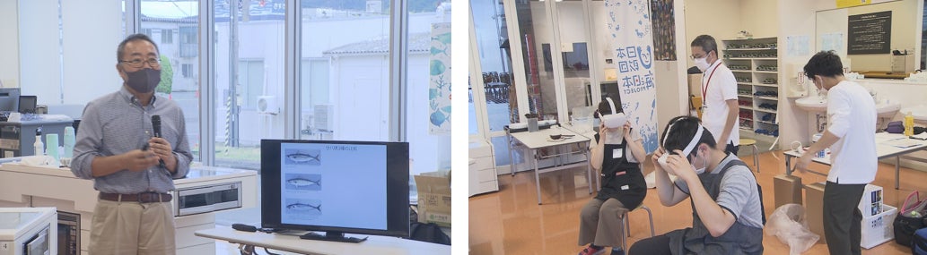 昭和49年に3580トン獲れた鯖が、平成28年には1トンにまで減少し、資源回復を目指し小浜でスタートしたのが「鯖、復活プロジェクト」です。福井県立大、小浜市、KDDIなどが連携しました。講義ではIoT機器やAIを駆使し、低コストかつ効率的な養殖技術の研究が進められている事などが紹介されました。また、福井県立大学 渡慶次 力教授によるフグ養殖場のVR体験も行われ、参加者の皆さんは食卓にのぼる魚の半分以上を占める「養殖魚」について興味を深めた様子でした。