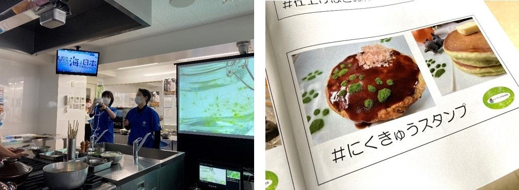 座学のラストは、宇和島市で青のり養殖のスリーラインズ(株)を営む山内満子さん。青のりの“赤ちゃん”を持参しての講義です。少子高齢化が進む地域の未来の子どもが、生きていける新しい産業を創造することを目指して、6年前にハマチやマダイの養殖から青のりに切り替えた経緯や、青のりの生産工程を解説。加えて、青のり普及のために地元企業とコラボして商品開発を行っていることや、SNS映えする調理例を紹介していました。山内さんは猫好きということで、試しに青のりで肉球を描いたおむすびなどを作って公開したところ、“いいね”がたくさんついたそうです。