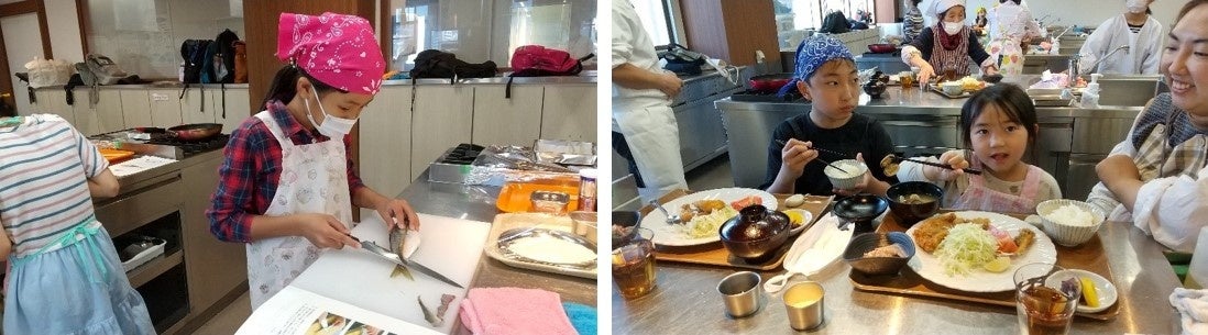 ②子どもがタコの下処理を体験、参加者全員がアジフライに挑戦。親子で試食