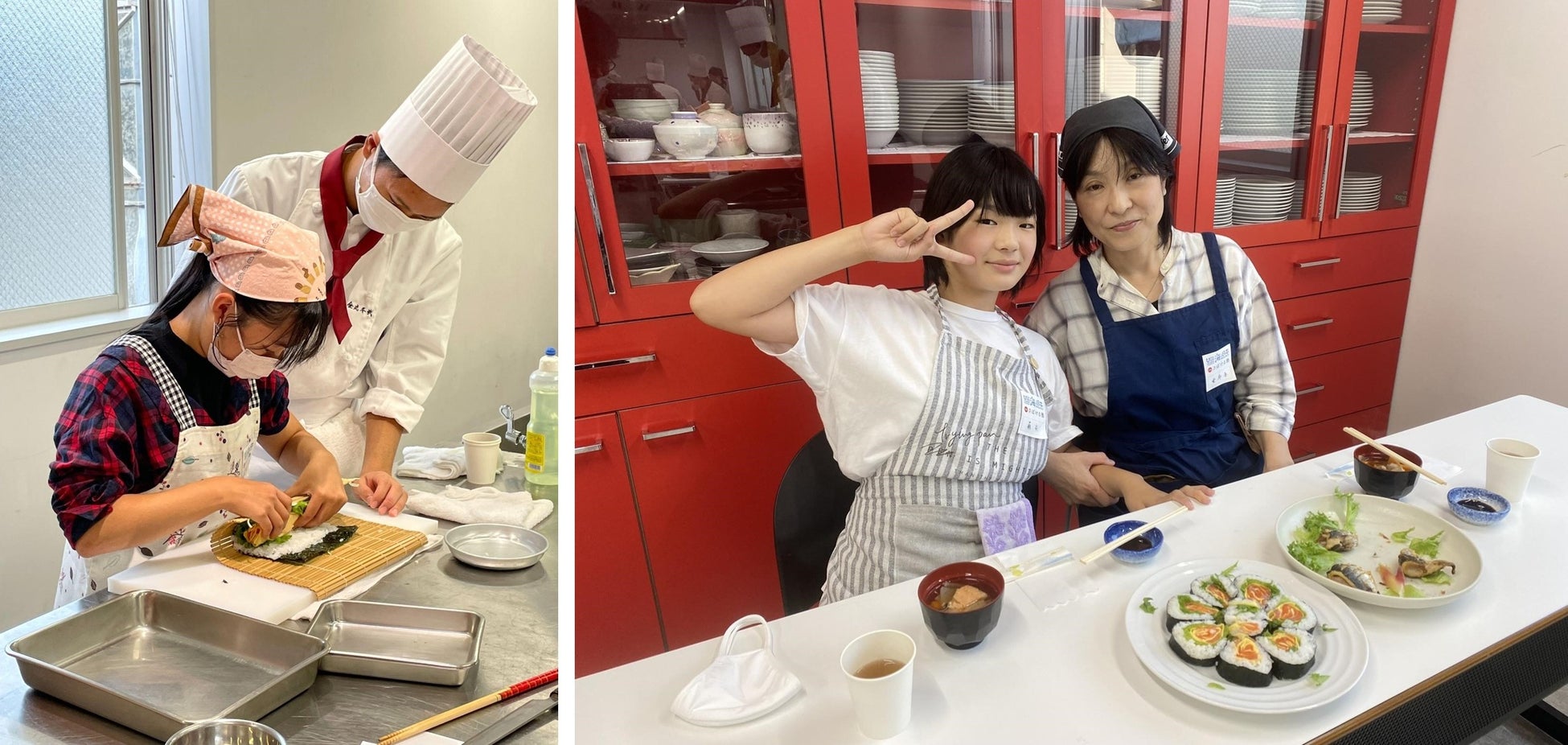 ②参加児童がアジの塩焼き、富士の介の太巻き、あら汁作りに挑戦。親子で試食。