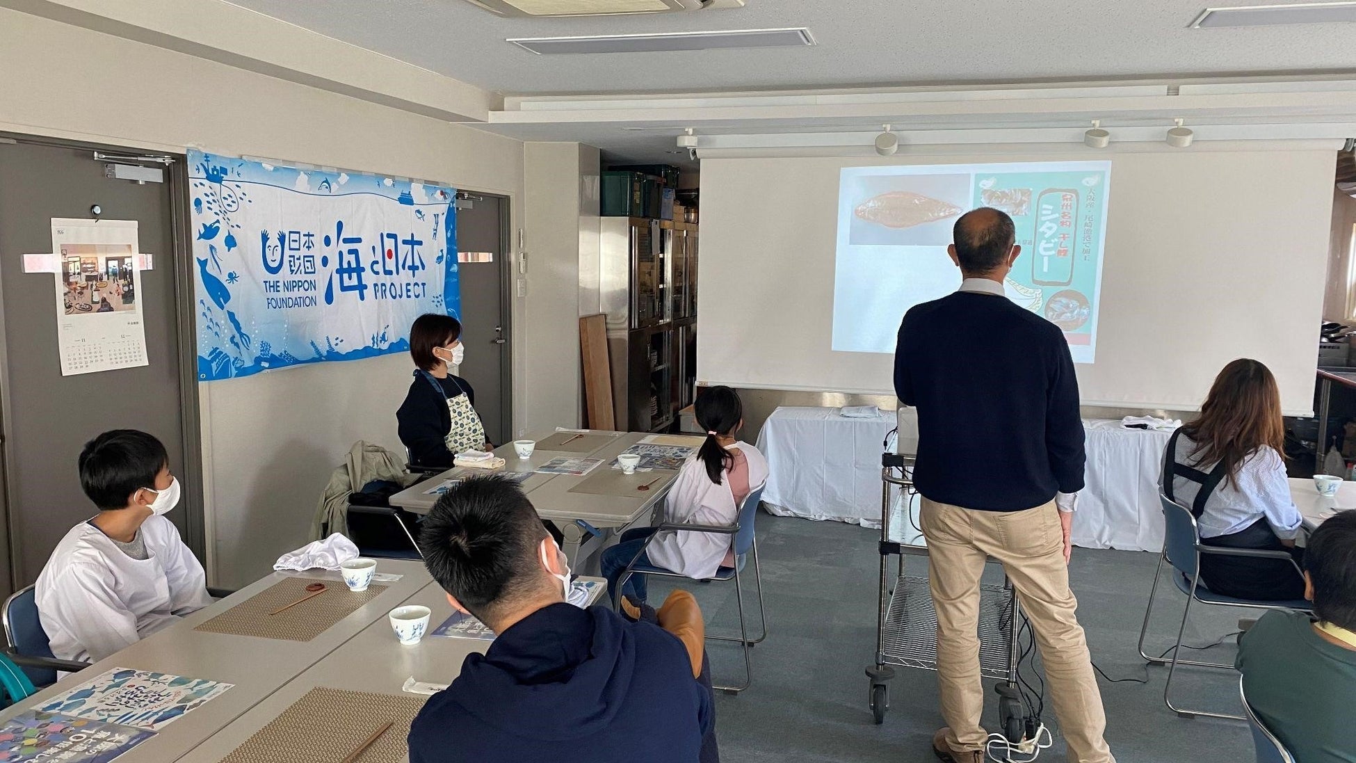まずは大阪湾の学びの講義を実施。大阪湾は魚庭(なにわ)の海と呼ばれ300種類以上の多様な生き物が生息しています。その理由は明石海峡、紀淡海峡からの強い潮流と淀川、大和川などの河川から流れ込む豊富な栄養分に恵まれた海だからです。子供たちは大阪湾の生物や漁業などについて学びました。また多くの生き物が生息する大阪湾ですが深刻化する環境問題により生き物の命が危機にさらされることも。大阪湾の生態系の変化、また生き物の命を脅かす海洋問題(海洋ごみ問題や赤潮など)とはどのようなものなのかを学び、これから必要なアクションを考えました。