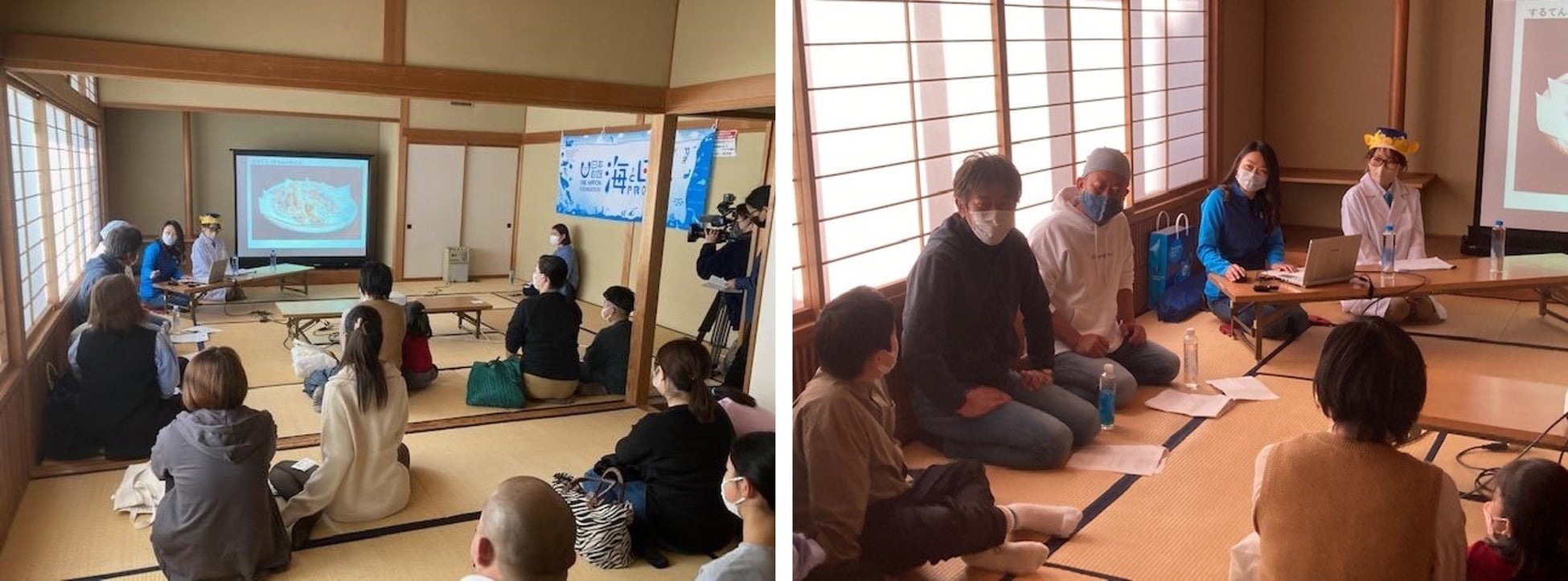 学びの時間は、一般社団法人スマイルストーリーの綱本さんと鮮魚店の秋間先生が担当。はじめに新潟の海が佐渡沖で暖流と寒流がぶつかり合い、信濃川や阿賀野川をはじめとする大小の河川が海に注ぎ込むため豊かな漁場となっていることの説明がありました。新潟県では初詣のお焚き上げや小正月の塞ノ神の行事でスルメイカを火であぶる独特の風習があったり、一夜干ししたスルメイカの天ぷら「する天」が県内全域で好まれたり、イカを愛する県民性があります。「スルメイカ」を、地域で一番多く獲れるイカとして「真イカ」と呼ぶことをクイズ形式で発表した際には、これまで知らなかったと驚きの声も上がりました。後半では、地元漁師の星野さん、小野塚さんも加わり漁の現場で感じる海洋環境の変化についても話をしてもらいました。今まで珍しかった小型のクジラやイルカが頻繁に漁場に現れるようになり、獲れる魚の種類も変わってきたそうです。未利用魚と呼ばれる魚が存在することにも触れ、参加者が聞き慣れない魚の名前にメモを取る様子も見られました。また、海洋環境のために我々ができることの一例としてビーチクリーンや市街地での清掃活動を紹介し、陸のごみが海に流れ込む現状も伝えました。