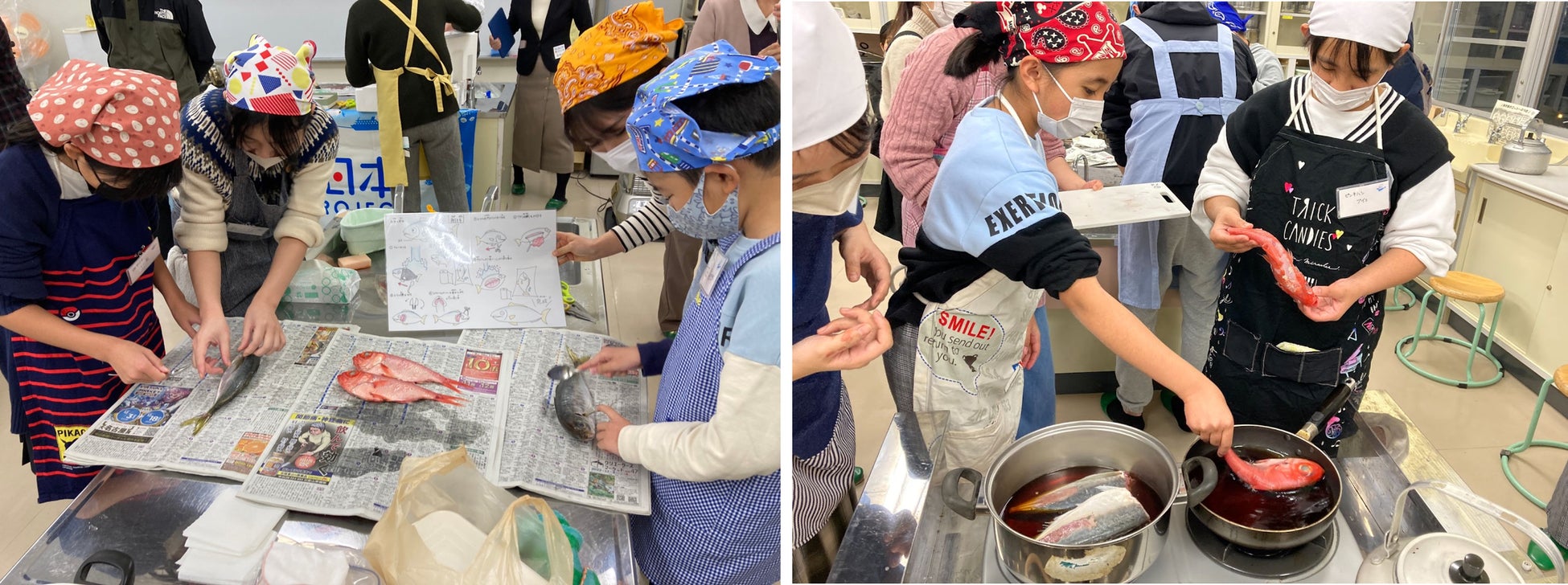 ②参加した小学生が魚をさばき、「アジ」「キンメ」の煮付けに挑戦。