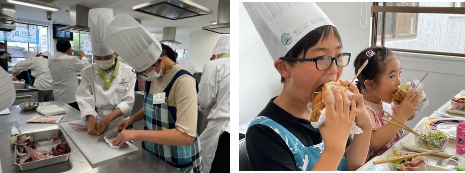 普段なかなかさばくことがないお魚。先生のデモンストレーションでは、大きなブリを包丁一本で手際良く切っていく姿に子どもたちは興味津々の様子でした。参加者は、田北調理師専門学校の学生さんたちのサポートを受けながら、アジの三枚おろしに挑戦!はじめての体験に苦戦しながらも、真剣な様子で一生懸命取り組んでいました。さばいたアジは「アジのハンバーガー」、カットしたブリは「お魚サラダ」にして大切に美味しく、命をいただきました。食後はさばけるライセンスが授与され、参加者は喜びの表情を浮かべていました。