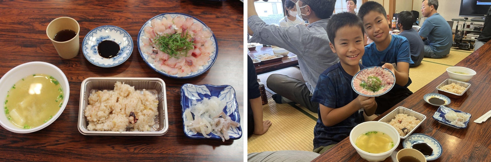 自分でさばいた刺身と、魚を余すことなく食べきる漁師街ならではのアラ汁、自ら獲ったタコのタコ飯でお昼ご飯タイム。「様々な体験を通して作った料理はとても美味しい」と感想が聞かれました。特に内臓入りのアラ汁は「コクがあって美味しい」と、お代わりする参加者が続きました。