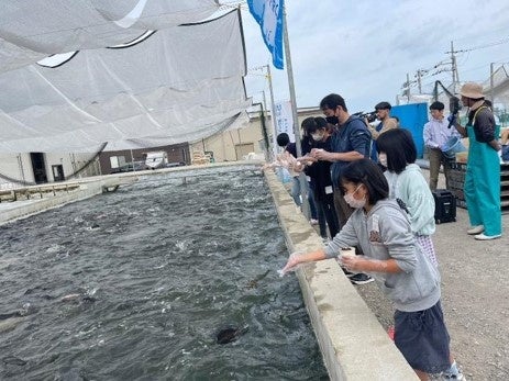 ②養殖現場で「琴浦グランサーモン」を育てる過程を見学しエサやりを体験する