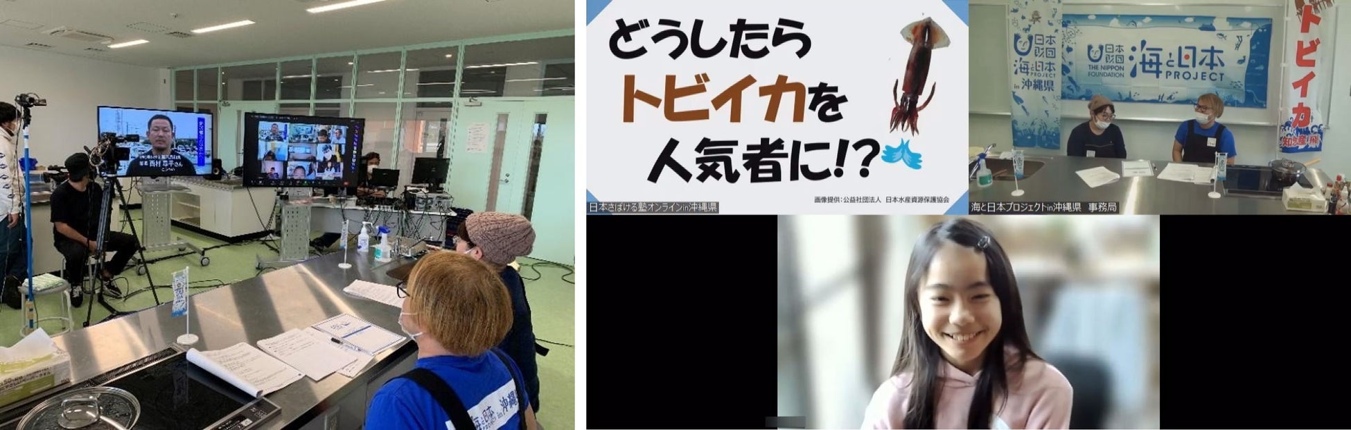今回のさばける塾 in 沖縄県は開催場所の糸満から遠く離れた各家庭からでも参加できるよう、オンラインで開催しました。まずは1時間目。司会進行にお笑い芸人「ゴリラコーポレーション」のこーへいさんを迎え、本日の主役、「トビイカ」について学んでいきます。こーへいさんはラジオの動物番組を担当したり、普段から釣りに出かけ釣った魚を自分でさばくなど魚に触れる機会は多いものの、トビイカは釣ったりさばいたりしたことはなかったそう。そこで糸満での漁師歴が20年という西村さんに、事前取材してきた映像でトビイカの生態や釣る様子を教えてもらいました。トビイカが沖縄近海で昔からよく釣れていることや、敵から逃れるため「飛ぶ」ことから名づけられたこと、さらにイカ釣り機で実際に釣っている映像が紹介され、参加者は興味深く視聴していました。