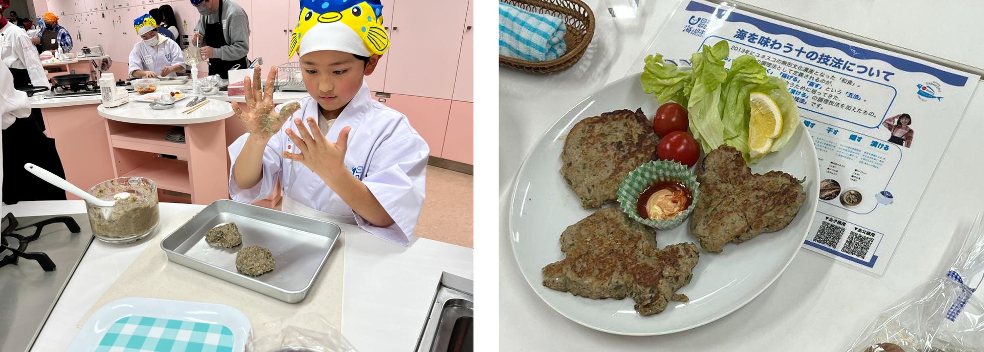 頑張ってさばいた「サンマ」を使用し、福島の郷土料理である「サンマのポーポー焼き」を調理します。海を味わう学びでは、名前の由来が「サンマの油で火がポーっと燃えた」ことである事を学びました。長ネギ、たまご、調味料と共に、フードプロセッサーで、やや粗めのなめらかさにします。そして、手で丸めてハンバーグの形に整えた上で、フライパンで焼いたら完成です。参加者の中には、サンマのポーポー焼きの形をハートや魚の形でつくり、食べるのには勿体ない程の出来栄えもありました。